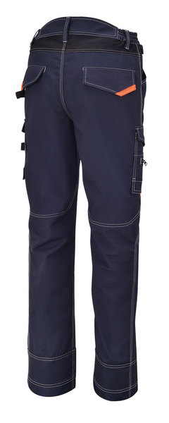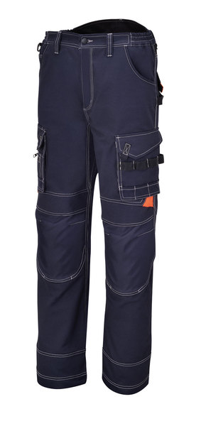 Beta spodnie robocze z wieloma kieszeniami 7816BL. Uszyte z płótna T/C, 260g/m², granatowe. Doły nogawek i kieszenie na nakolanniki wzmocnione poliestrem 600D. Elastyczna wstawka z tyłu spodni ułatwiająca ruchy. Wzmocnione w kroku.